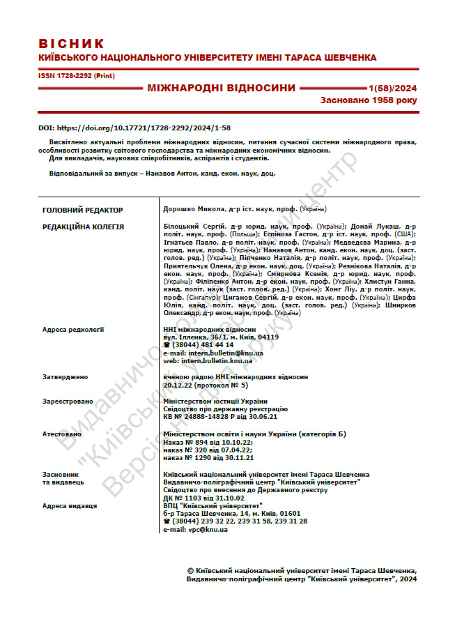 Том 58 № 1 (2024)Представлено дослідження актуальних проблем міжнародних відносин, питання сучасної системи міжнародного права і особливості розвитку світового господарства та міжнародних економічних відносин.
